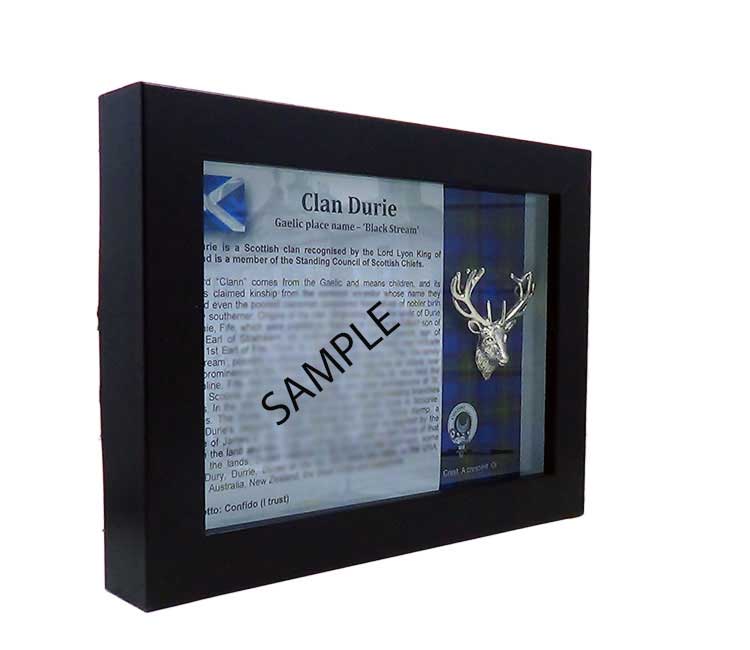 Proudly displayed in an attractive framed presentation is the Tartan of Clan Durie, along with the clan’s crest and the famous Scottish Stag!