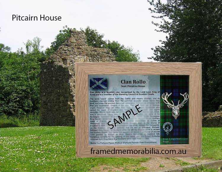 We are excited to showcase a beautifully framed memorabilia collection featuring the Scottish Kilt tartan, motto and heraldic crest of Clan Rollo. A Scottish clan (from Scottish Gaelic clann, literally ‘children’, more broadly ‘kindred’) is a kinship group among the Scottish Highland and Lowland people of Scotland. Clans give members a sense of shared heritage and descent. In modern times, there is an official structure recognised by the Court of the Lord Lyon, which regulates Scottish heraldry and coats of arms. This would make a Great Surname Gift For Dad or Grandad!