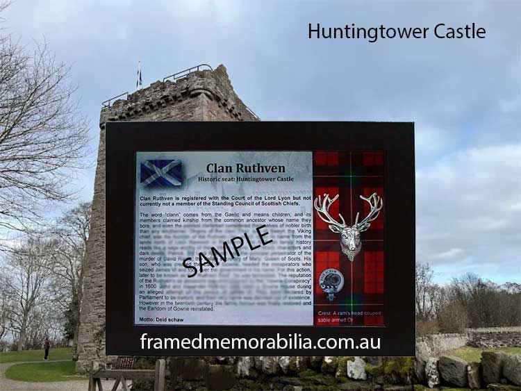 Proudly displayed in an attractive framed presentation is the Tartan of Clan Ruthven, along with the clan’s crest, motto and our famous Scottish Stag!